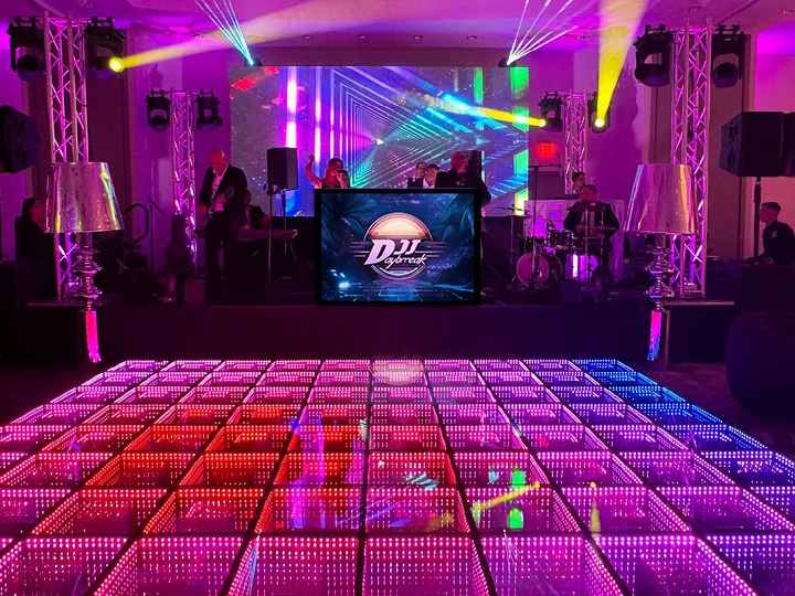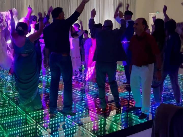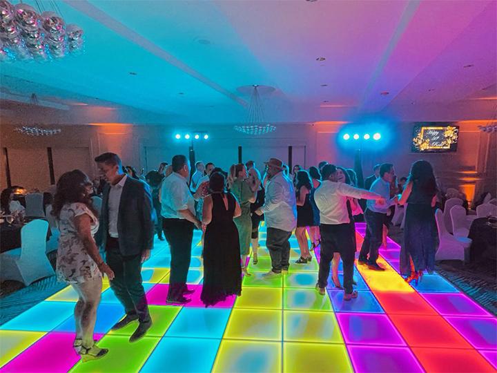 Interactive LED floors respond to guests’ movements, creating dynamic visual effects that transform as people dance. These high-engagement floors command $25–$50 per square foot for weddings and mitzvahs, making them among the most profitable dance floors rental options available.